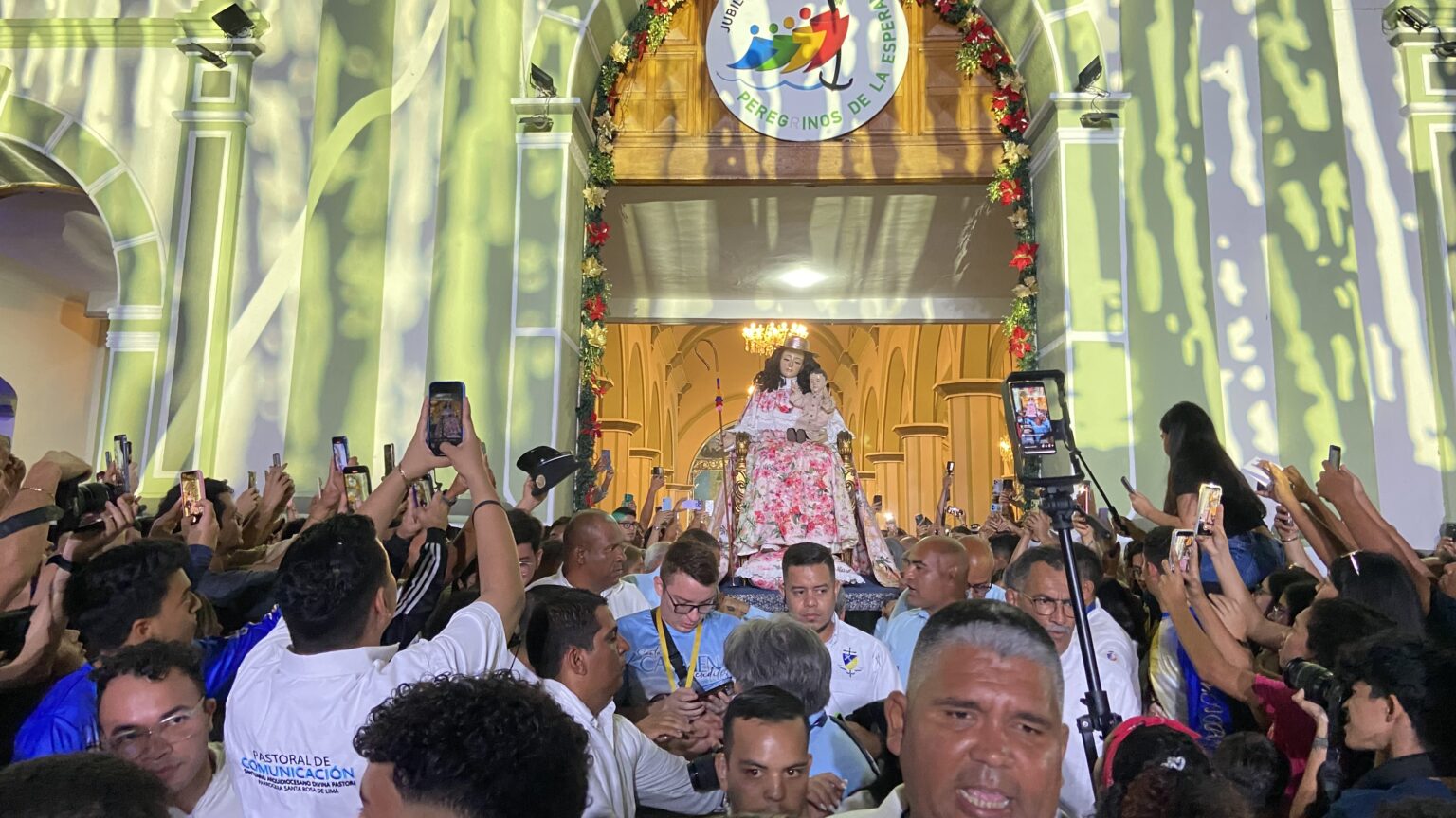 Fieles pueden ver a la imagen de la Divina Pastora con su nuevo traje. Foto cortesía Radio Fe y Alegría Los feligreses se congregaron nuevamente en Santa Rosa para presenciar la bajada de la Divina Pastora, ceremonia en la cual la imagen de la patrona del estado Lara desciende de su nicho para mostrarse previamente al 14 de enero, día en el que sale de la iglesia de Santa Rosa para su tradicional visita a Barquisimeto.Según informó el diario El Impulso, el evento acontecido la tarde del 5 de enero permitió a las personas apreciar de cerca los detalles del vestido que lucirá en su visita número 168. Se trata de una prenda que muestra detalles de la historia de El Tocuyo, llamada Ciudad Madre, por ser la primera ciudad fundada tierra adentro en la Provincia de Venezuela, siendo la base para la creación de ciudades como Barquisimeto, Carora, y Trujillo.«El foco de atención se centró en la falda y el manto, donde el trabajo manual de ilustración y bordado cobra protagonismo. En la falda, las fotografías destacan tres elementos botánicos: los lirios, que simbolizan la pureza; la cayena, flor emblemática de las plazas tocuyanas; y la caña de azúcar, motor económico del Valle del Río Tocuyo. Cada pieza fue pintada y bordada a mano, logrando una textura que resalta bajo la iluminación del templo de Santa Rosa. Sin embargo, el elemento de mayor valor histórico visible en los retratos es el manto. Diseñado como un lienzo cartográfico, reproduce fielmente el mapa de El Tocuyo del año 1579, bajo el nombre de “La Ciudad de El Toquio”, destaca el periodista José Escalona en su crónica para El Impulso. La ceremonia de presentación de la bajada del nicho de la Divina Pastora es uno de los eventos que la felicidad espera para ver el vestido que lucirá la virgen en la procesión del 14 de enero, considerada la más grande de América Latina y una de las que mayores. devotos convoca en Venezuela. Con la bajada de la imagen de la Divina Pastora, se marca el inicio formal de las festividades litúrgicas marianas, previa a la visita número 168 de la patrona a la ciudad de Barquisimeto.