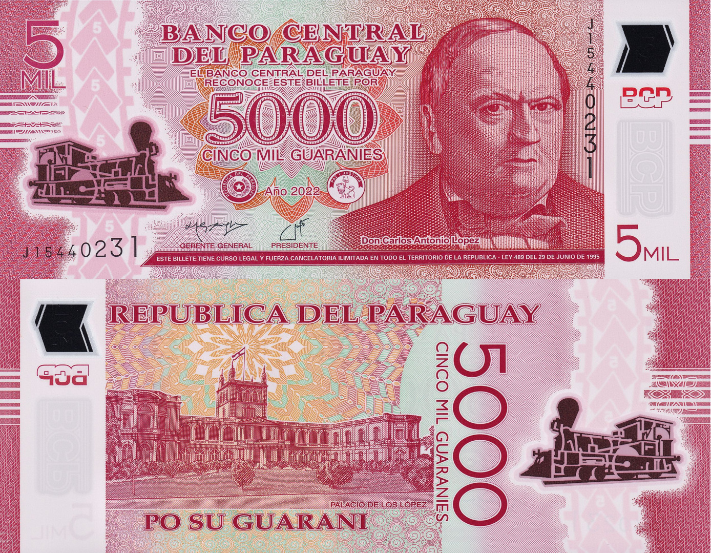 Cambiar materiales, preservar el patrimonio El billete de 5.000 guaraníes de Paraguay se caracteriza por una impresión roja y multicolor, tonos que evocan energía y progreso, temas asociados con el desarrollo de la nación. En el anverso aparece un retrato de Don Carlos Antonio López, primer presidente de Paraguay (1844-1862), junto al Escudo Nacional y el emblema del Tesoro: un león con gorro frigio y la inscripción “Paz y Justicia”. (Paz y Justicia).