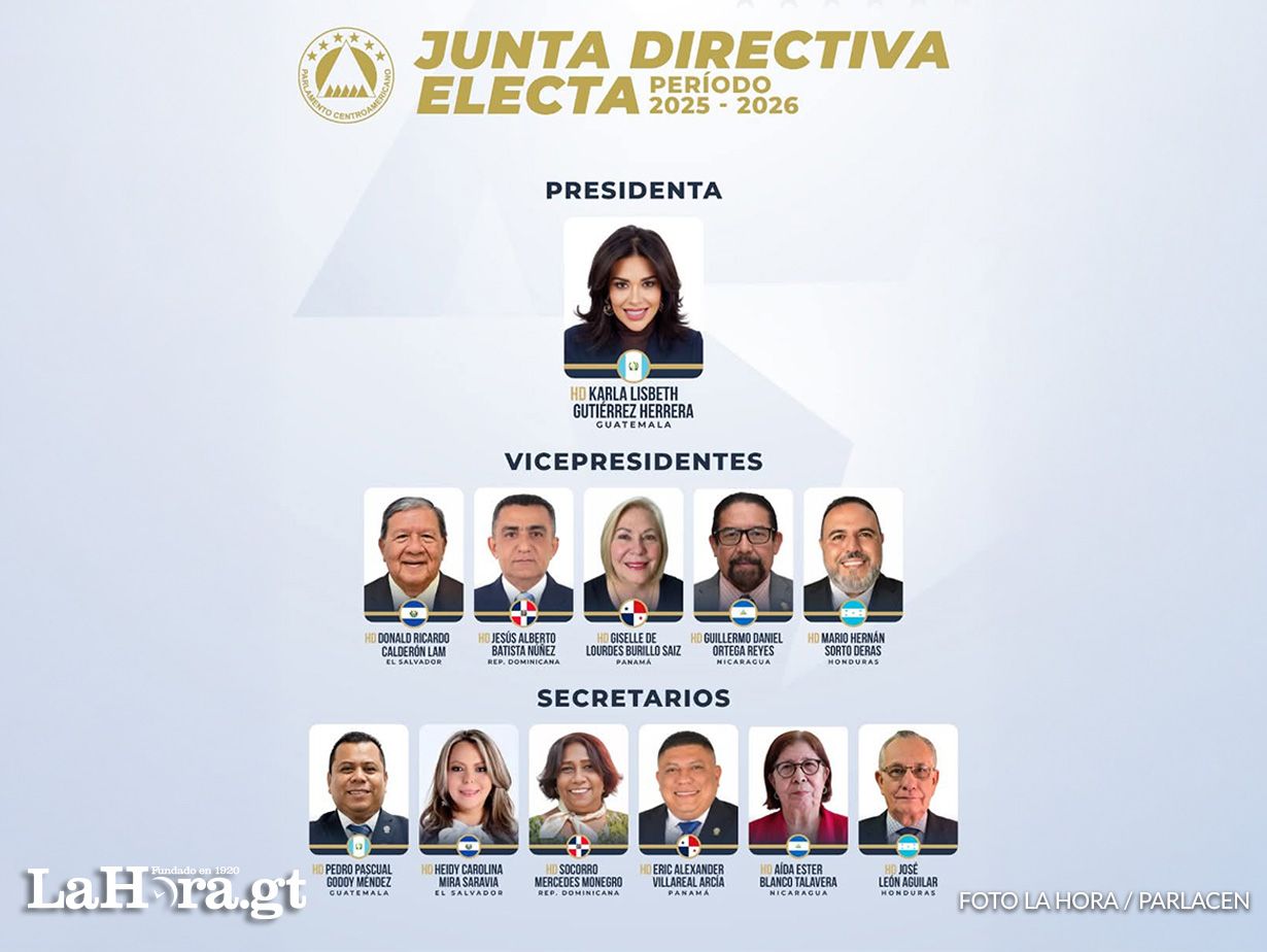 La junta directiva del Parlacen 2025 quedó conformada así. Foto: Parlamento Centroamericano Tras la elección de la junta directiva del Parlamento Centroamericano (Parlacen) 2025, el partido Unidad Nacional de la Esperanza (UNE) enfrenta una disputa con una de sus integrantes, que dirigirá el organismo regional.