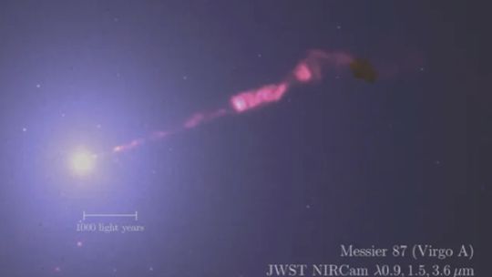 El Telescopio Espacial James Webb (JWST) descubrió algo muy emocionante saliendo del primer agujero negro jamás fotografiado hasta el presente, que es el supermasivo M87*, ubicado en la galaxia Messier 87, a 54 millones de años luz de la Tierra. Las nuevas imágenes en infrarrojo muestran con detalle sin precedentes los chorros de partículas subatómicas (“jets”) que emergen del agujero negro a casi la velocidad de la luz.