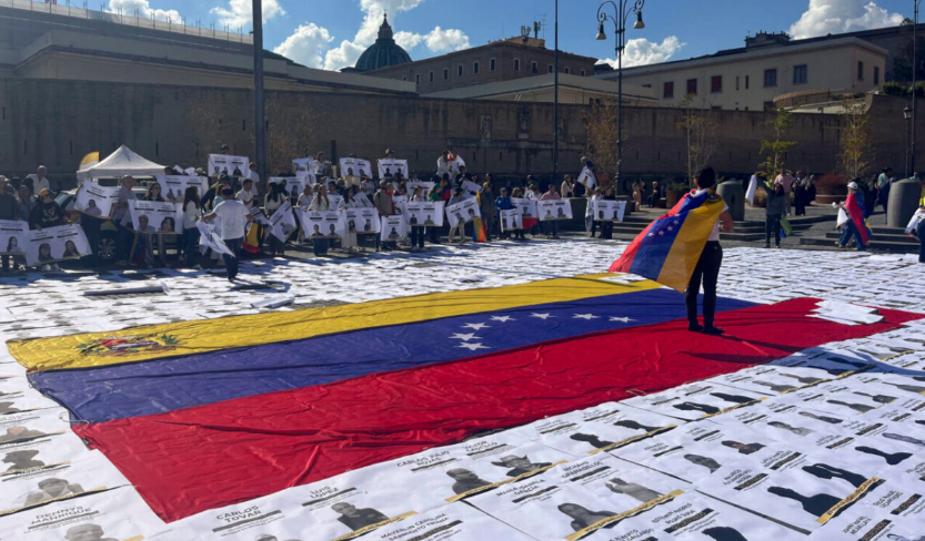 La plaza del Risorgimento fue escenario de la capacidad de lucha y organización del pueblo venezolano, que reclamó a viva voz la liberación de los más de 800 presos políticos con una alfombra de sus rostros impresos en cartulina blanca y la bandera tricolor. Mientras tanto, el Sistema Nacional de Orquestas Juveniles e Infantiles buscaba lavarle la cara al régimen unos metros más allá, en la Basílica de San Pedro, bajo el lema de la “Venezuela cultural”. Personeros como el excanciller Roy Chaderton y la alcaldesa del municipio Libertador, Carmen Meléndez, se colaron con más pena que gloria entre una mayoría opositora.