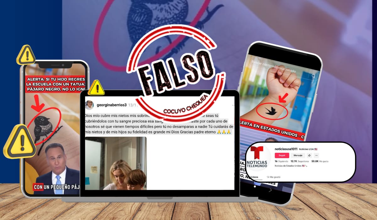 Si tienes poco tiempo te resumimos en pocos segundos: La desinformación se originó en una cuenta de TikTok (@noticiasusa1011) que suplanta a Telemundo Noticias y utiliza Inteligencia Artificial para falsificar imágenes y voces de periodistas. No hay registros web ni denuncias oficiales que confirman la existencia de estos tatuajes con códigos secretos o la presencia de camionetas de vigilancia. El temor y el ausentismo escolar de los padres migrantes están ligados a las redadas del ICE, una situación real, y no al video viral falso.La llegada de Donald Trump al poder en Estados Unidos, en su segundo mandato, ha estado marcada por las políticas contra los inmigrantes, mayormente contra la población latina, que para este 2025 se estima en 68 millones, según reporte del proyecto Latino GDP de la Universidad de California Los Ángeles (Ucla) y la California Lutheran University. A pesar de esto la política de redadas y arrestos a migrantes en situación irregular se ha enfocado especialmente en esta comunidad, y las desinformaciones sobre este tipo de políticas han inundado las redes sociales. Uno de esos bulos llegó a nuestro chatbot, llamado la Tía del WhatsApp, utilizado para contrarrestar los efectos de la desinformación, y que también está en Telegram, en la que un video desinformador señala que en escuelas estadounidenses están haciendo a los niños hijos de migrantes con tatuajes temporales para identificarlos, pero esto es falso.Ante dudas sobre posibles estafas o contenidos engañosos, puedes consultar a La Tía del WhatsApp, disponible también en Telegram, el chatbot de verificación de información de Efecto Cocuyo.Qué dice la desinformación El video desinformador que llegó a nuestro chatbot, que proviene de la plataforma Threads, fue publicado en la cuenta de Georgina Berrios, pero la pieza se publicó originalmente en la red social TikTok, a través del perfil @noticiasusa1011, un falso noticiero que imita la identidad gráfica del canal de televisión Telemundo.En el audiovisual, que tiene una duración de un 1:17, se utiliza la imagen y voz (alterada con IA) del periodista José Díaz-Balart, que trabajó en la cadena Telemundo, se asegura que “A partir del lunes, 10 de noviembre, varias escuelas empezarán a entregar tatuajes temporales educativos a los niños durante clases de arte y actividades lúdicas. Oficialmente dicen que forman parte de un programa de creatividad, pero madres inmigrantes ya alertan que se trata de algo mucho más. oscuro”. El video advierte a los padres que si sus hijos regresan de la escuela con un pájaro negro dibujado en el brazo o la muñeca, no lo ignora y que este dibujo o tatuaje temporal es difícil de borrar con agua o jabón. “Algunos padres notaron que bajo luz ultravioleta, dentro del dibujo, aparecen números diminutos como si fueran códigos internos. Primer error, creo que es un simple juego escolar”, se lee. El video desinformador también señala que luego de que aparecieron estos tatuajes, en los alrededores de los colegios se reportaron camionetas sin placas vigilando las salidas. “Estos tatuajes funcionan como marcas silenciosas que ponen en riesgo a los hijos de inmigrantes. Y lo más grave, desde mañana se volverán parte de la rutina escolar. Revisa los brazos y las manos de tu hijo al llegar a casa”, dice la desinformación. Detalles de las cuentasComo explicamos en párrafos de arriba, la desinformación se originó en la red social TikTok, pero luego se viralizó también en redes como Threads, específicamente en la cuenta de georginaberrios3, el 13 de noviembre de 2025.La publicación, que fue difundida con el siguiente mensaje: “Dios mío cubre mis nietos mis sobrinos mi familia allá en ese que seas tú cubriéndolos con tu sangre preciosa esa sangre que tú derramaste por cada uno de nosotros sé que vienen tiempos difíciles pero tú no desamparas a nadie Tú cuidarás de mis nietos y de mis hijos su fidelidad es grande mi Dios Gracias padre eterno”, alcanzó en Threads 9.900 compartidos, 3 mil 200 me gustas, 416 reposteos y 402 comentarios (algunos señalando que se trata de información falsa). Al hacer una revisión del perfil de Georgina Berrios, pudimos observar que no comparte usualmente este tipo de contenido. Con solo 66 seguidores, tiene publicaciones sobre religión y reflexiones, como aquí y aquí, por lo que podemos inferir que el video pudo haber sido compartido desde una emoción vinculada con el miedo auténtico de que uno de sus familiares pudiera estar en peligro, pero sin intención explícita de desinformar. Por eso siempre te invitamos a revisar sesgos y emociones al consumir y compartir contenido en Internet, para no propagar contenido engañoso involuntariamente. Por otro lado, la cuenta que sí comparte este tipo de desinformaciones con una intencionalidad de engaño o confusión es el perfil “noticiasusa1011-Noticias USA 🇺🇸” en TikTok, que comparte contenido, al menos desde el 28 de septiembre de 2025, fecha de su primer video en la plataforma de vídeos.Este usuario suplanta la identidad de Noticias Telemundo en Estados Unidos al usar su logotipo, imagen y estilo de forma fraudulenta. Aún así, al momento de publicar este chequeo, cuenta con 12 mil 700 seguidores y ha acumulado más de 50 mil me gustas, de usuarios que no se han percatado del engaño. Uso malicio de la inteligencia artificial La cuenta desinformadora ha publicado al menos 36 videos creados mediante Inteligencia Artificial Generativa para incluir la imagen de personalidades conocidas en Noticias Telemundo, como los periodistas José Díaz Balart, Julio Vaqueiro y Enrique Acevedo. Por ejemplo, en este video usaron la imagen de Vaqueiro para asegurar que el 8 de octubre habría un toque de queda infantil, algo que no ocurrió y que tampoco era cierto. Mientras que en este, los desinformadores usaron la imagen de Díaz Balart para difundir información falsa sobre el tatuaje del pá