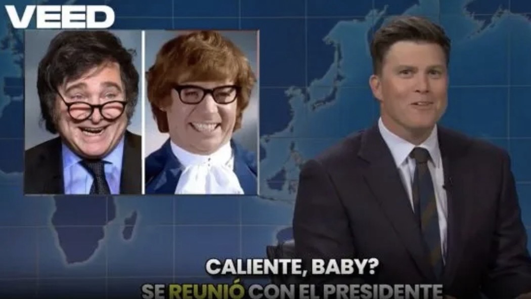 El conductor Colin Jost presentó la noticia con una foto del mandatario argentino y de Austin Powers, el bizarro personaje británico de las comedias de Mike Myers: “El presidente argentino, Javier Milei, fue visto aquí diciendo: ‘If you make me horny, baby’ (‘Si me enloquecés, nena’)”, manifestó entre risas generalizadas del público presente.