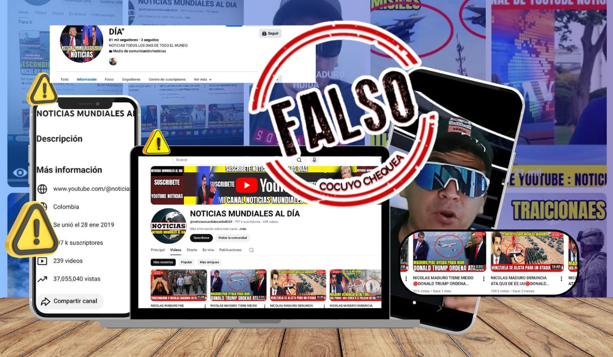 Si tienes poco tiempo te resumimos lo que hace Noticias Mundiales al Día en pocos segundos: Acumula casi 800 mil suscriptores, ópera desde Colombia y gran parte de sus 239 videos contienen la palabra «Maduro» en el titular. El contenido es falso, como el supuesto «Plan Desalojo» de Trump o ataques de EE.UU. a Venezuela.El canal también difunde bulos en otras redes sociales, como Facebook, con videos cortos para promocionar su canal de YouTube.En el mundo de las desinformaciones el nombre de Nicolás Maduro, el gobernante de Venezuela, suele ser utilizado para darle más viralidad a un contenido: bulos como Maduro se fue, renunció o murió se han publicado Múltiples veces en las plataformas digitales para engañar a más de un desprevenido. Y es que el universo desinformador en el que se usa el nombre de Maduro, en muchas ocasiones también es alimentado por el mismo mandatario, quien en oportunidades desinforma, como reveló este reportaje realizado junto a la coalición C-Informa, en que dimos detalles de cómo Maduro utilizó la cumbre climática de la COP27 para proyectar una falsa imagen de protector ambiental recicladas. Así mismo, utilizando la figura de Maduro —como principal fuente de desinformación— encontramos un canal de Youtube que viraliza desinformación sobre el gobernante venezolano y la tensión militar por el despliegue naval de Estados Unidos en el Mar Caribe y cuyo enlace fue enviado a nuestro chatbot La Tía del WhatsApp, utilizado para contrarrestar los efectos de la desinformación, que también está en Telegram, en el que hay un montón de videos falsos relacionados con el gobernante chavista. Este chequeo es el resultado del apego riguroso a nuestra metodología de verificación, tras el análisis y contraste con las evidencias disponibles y no representa opiniones o juicios de valor, tal como lo establecemos en nuestra Política de Neutralidad. y Apartidismo, en la que advertimos las limitaciones al ejercicio del periodismo en Venezuela. Así que te contamos los detalles.Un canal desinformativoNoticias Mundiales al Día es el nombre del canal desinformador, que acumula casi 800 mil suscriptores en YouTube y fue creado el 28 de enero de 2019 y opera desde Colombia, según señala su información en esa plataforma de videos. El canal ha publicado por lo menos 239 videos en YouTube, aunque al hacer clic en el botón para el historial del canal, solo se desglosan 32 audiovisuales, de los cuales 30 contienen la palabra “Maduro” en el titular, como puede ver en la imagen que adjuntamos debajo de este párrafo. Su estilo estético siempre es alarmista, de última hora y con letras grandes amarillas y blancas sobre fondos rojos. Su video más viral, una falsa captura de MaduroDe los videos públicos encontrados en este canal desinformador, el más popular fue subido el 14 de septiembre de 2025 y acumula 159 mil vistas y 585 comentarios, en el que muchos parecen darle veracidad al contenido. En este video viral, titulado “NICOLAS MADURO SE LE METIERON 🔴DONALD TRUMP ACTIVA PLAN DESALOJO DE MIRAFLORES🔴DIOSDADO TIENE MIEDO”, el cual tiene una duración de 16 minutos y 30 segundos, se asegura falsamente que un avión estadounidense entró a Venezuela para sacar a Maduro, usando en una entrevista a Luis Quiñonez, un presunto experto en conflictos bélicos, que aunque se presenta en muchas ocasiones como si trabajara para el actual gobierno de Trump, sus declaraciones no son oficiales ni tienen respaldo en información pública, y además, no se han cumplido sus predicciones, como señalamos en esta nota. Y aunque más de dos meses después de la falsa operación militar contra Maduro no ha ocurrido, el canal continúa publicando presuntas noticias sobre la salida, exilio o captura del gobernante venezolano por parte de EE.UU. UU.El más antiguo, una manipulación de un hecho realAsí mismo, el audiovisual más antiguo que se puede encontrar en el canal fue publicado el 13 de abril de 2024, y también es una desinformación que implica a Maduro, asegurando según si título que “DOBLEGARON A NICOLAS MADURO PIDIO REUNION SECRETA CON GOBIERNO DE JOE BIDEN – MARIA CORINA EL FIN”.Esta publicación alcanzó 28 mil reproducciones, con 1.600 me gustas y 95 comentarios, en los que muchos usuarios dan credibilidad a la desinformación.En este primer video disponible se promueve la intervención militar en el país como única solución al conflicto venezolano y tiene una duración de 10 minutos y 30 segundos, donde además se afirma que representantes de Maduro sostuvieron una reunión “secreta” con funcionarios del gobierno de Estados Unidos en México, un encuentro que sí fue real, pero fue para abordar las garantías políticas para las elecciones del 28 de julio de 2024. Además, el video señala que Laura Richardson, entonces Jefa del Comando Sur de los Estados Unidos, estaba preparada para un ataque desde Guyana, situación que no ocurrió, pero cabe destacar que la figura de esta generala estadounidense fue utilizada en Múltiples ocasiones cuando se desinforma sobre presuntas intervenciones militares “inminentes” en Venezuela, como aquí y aquí. Este canal también desinforma mediante videos en vivo, como por ejemplo aquí, donde el presentador del canal aseguró que Estados Unidos atacaría a Venezuela durante la madrugada del 27 de noviembre de 2025, situación que tampoco ocurrió. También desinforma en otras redes socialesEn otras redes sociales como Facebook también se encontraron rastros de este canal desinformador, ya que tiene su propia página con cerca de 81 mil seguidores y está registrado en la categoría “medios de comunicación”, según la información de la página. La mayoría del contenido que se publica en este perfil son videos cortos para promocionar el canal de Youtube, como puede ver acá. Quién está detrásEstos videos desinformadores son publicados por un usuario con un acento de Colombia, que utili