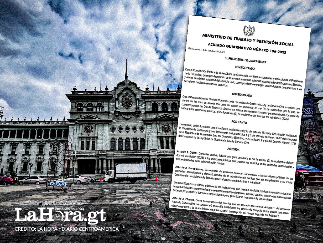 Foto La Hora: Diseño de Jesús Ríos. El presidente de la República, Bernardo Arévalo, aprobó el Acuerdo Gubernativo número 186-2025, mediante el cual se concede asueto laboral con goce de salario el lunes 3 de noviembre de 2025 a los trabajadores públicos que laboran en entidades centralizadas y descentralizadas del Estado.