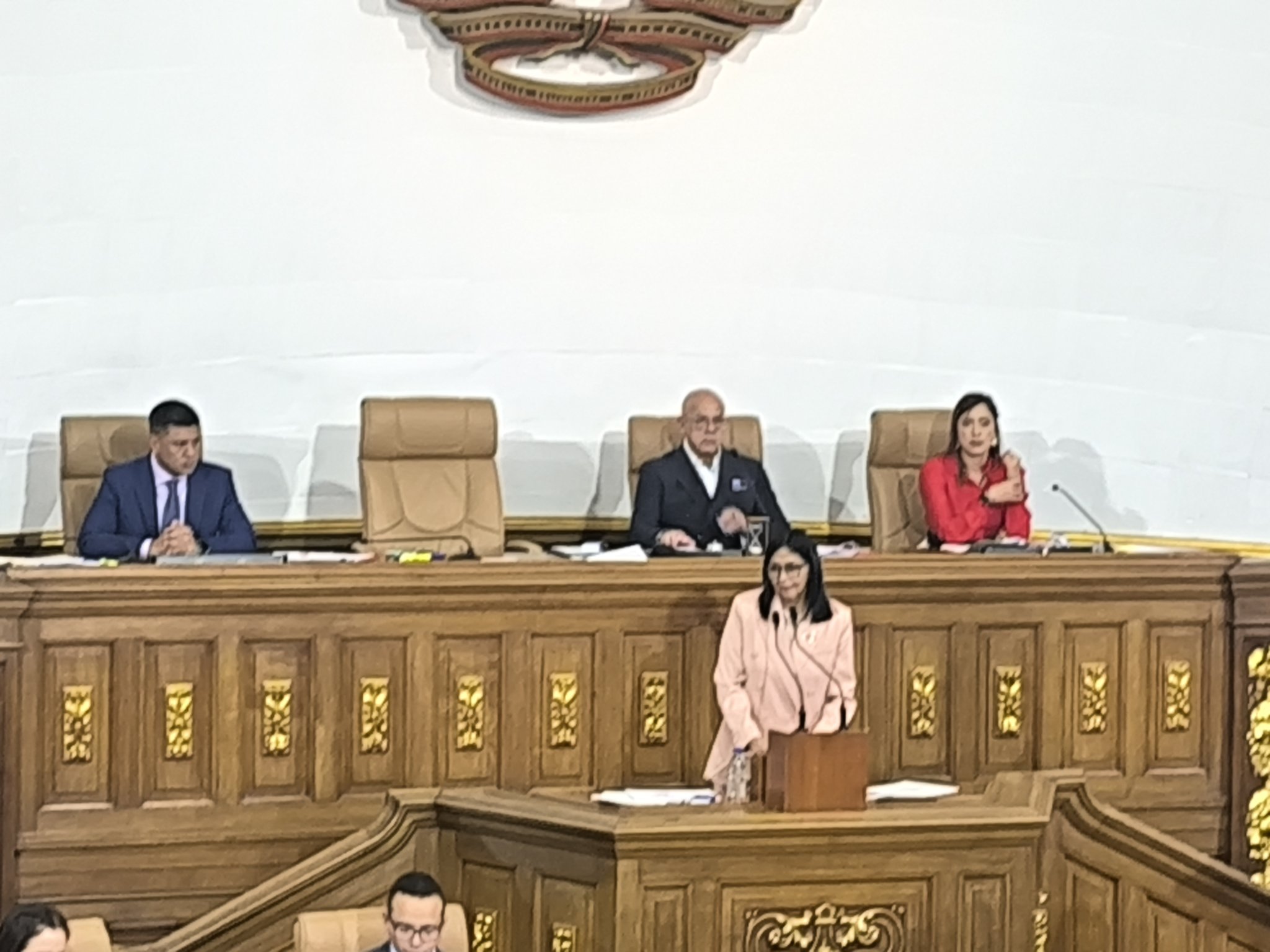 Delcy Rodríguez no habló de premisas de crecimiento, inflación ni precio del petróleo sobre las que se calculó el presupuesto de nacionalidad. Foto: AN La Asamblea Nacional (AN) dominada por el chavismo permitió en primera discusión las leyes de Presupuesto para el Ejercicio Económico Financiero 2026 y la Ley Especial de Endeudamiento. La vicepresidenta Delcy Rodríguez presentó en el hemiciclo de sesiones el presupuesto nacional para el año entrante, por 5 billones 022 mil 968 millones 785 mil 870 bolívares, equivalente a 19.941.911.965 dólares, según el tipo de cambio oficial del Banco Central (BCV). El monto equivale a un 12% menos en comparación con el monto aprobado para 2025, cuando el presupuesto ascendió a poco más de 22 mil millones de dólares. Pero la alta funcionaria destacó que el 77% -igual porcentaje que el año pasado- será destinado a la inversión social. De dicho porcentaje, el mayor será destinado al área de “Desarrollo social y participación”, con 29,9%, seguido de “Seguridad y servicios internos” por 12,5%; mientras que salud y seguridad social recibirá 6,5%En esta oportunidad, Rodríguez tampoco habló de las premisas de crecimiento, inflación ni precio del petróleo, sobre las que se calculó el balance de ingresos y egresos. Seguridad y defensa La también ministra de Hidrocarburos recalcó durante la sesión militar ordinaria de este jueves 4 de diciembre, que Venezuela sigue de pie a pesar del “despliegue dantesco de fuerzas estadounidenses» en aguas del mar Caribe cercanas a Venezuela. contemplado los recursos que se requieren para la seguridad y para la defensa del país.El pasado 12 de noviembre, el miembro de Acción Democrática (judicializada, bajo el control de Bernabe Gutierrez), Negal Morales, advirtió que era un “error” priorizar el tema bélico en el presupuesto nacional, en medio de necesidades en las áreas de salud y educación que no pueden esperar por la solución del conflicto político.«Hoy podemos mostrar que venimos en un proceso franco de recuperación de la producción petrolera mirando con esfuerzo propio, pero siempre hacia el futuro y con una meta que fijó el presidente para finales de este año de llegar a 1.200.000 barriles», aseguró igualmente la vicepresidenta Públicas “Normalidad institucional” Oscar Ronderos por la Alianza Democrática, expresó que la bancada apoya las leyes de Presupuesto y Endeudamiento para demostrar la “normalidad institucional” del país a pesar de las amenazas externas y las sanciones internacionales. otro término que “en tiempos de revolución”, parece más a su intención que es mejorar la calidad de vida de la población Ronderos le respondió que es “imposible” el cambio de nombre porque está expresamente señalado en el artículo 312 de la Constitución.